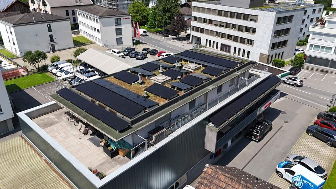 Für die Schlossgarage Lampert in Vaduz wurde eine leistungsstarke Solaranlage realisiert, die das Gebäude effizient mit erneuerbarer Energie versorgt. Die Aufdachanlage ist unauffällig in das Gebäude integriert und leistet einen wichtigen Beitrag zur Reduzierung des CO₂-Ausstosses. Durch den Einsatz modernster Solartechnologie wird nicht nur die Umwelt geschont, sondern auch der langfristige Energiebedarf nachhaltig gedeckt.